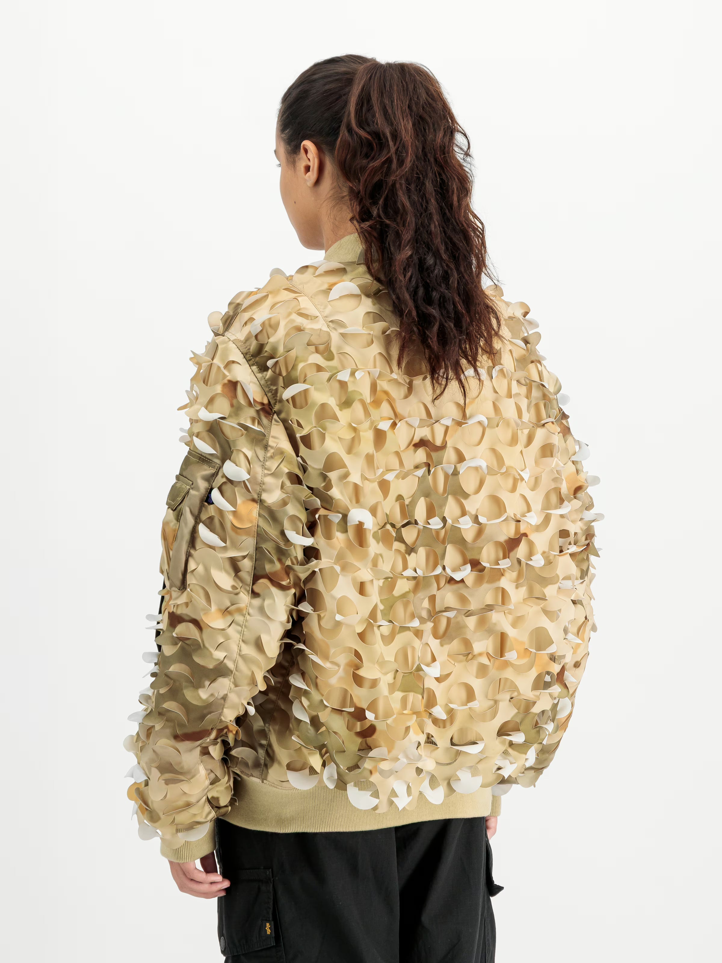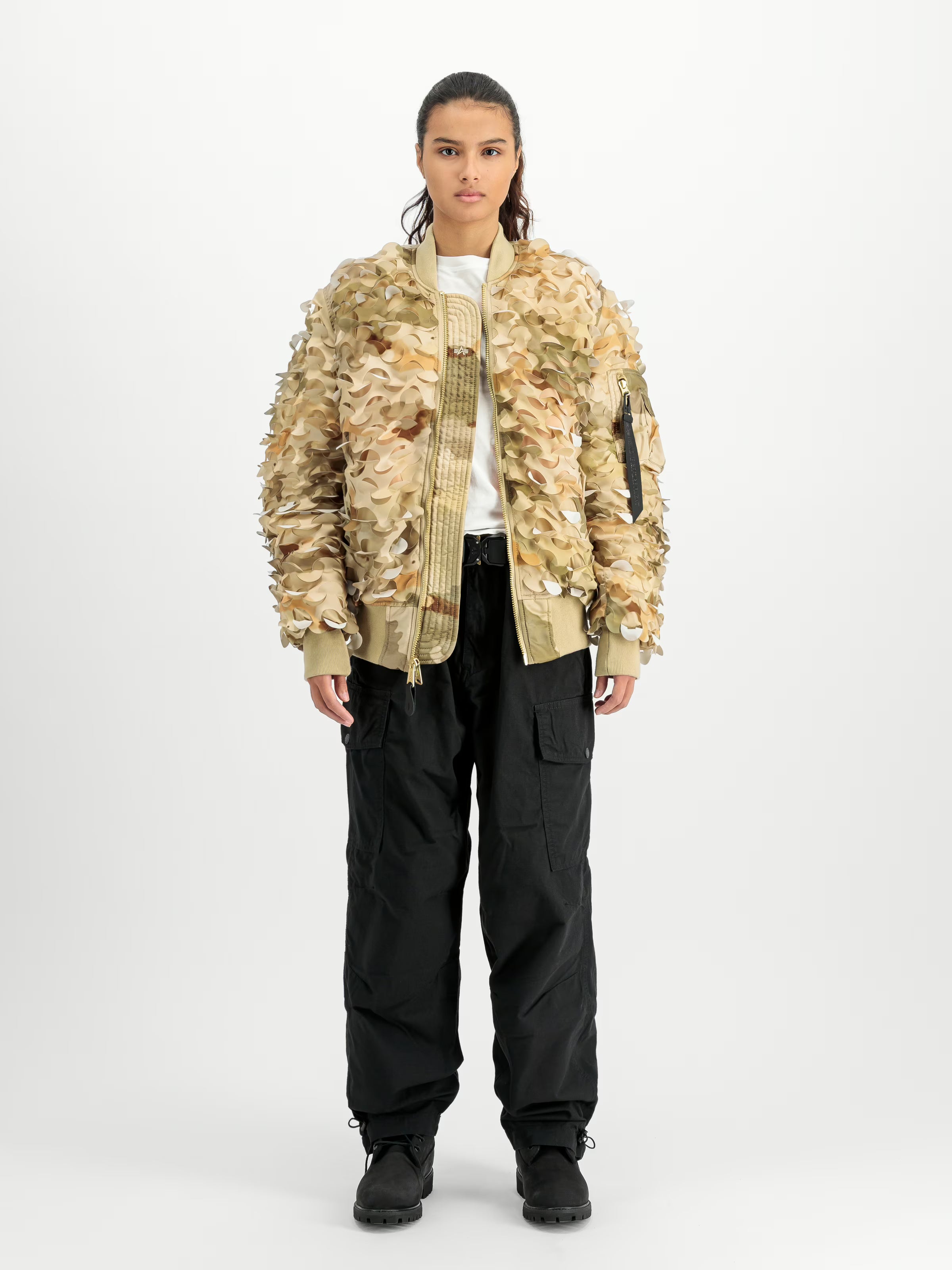 The MA-1 ULCANS Flight Jacket by Alpha Industries brings military style into everyday wear. This unisex bomber is both a statement piece and a functional addition to any wardrobe. Made from 100% nylon with a durable 200 g/m² construction, the heavy flight nylon fabric is wind-resistant and long-lasting, enhanced by a camouflage-net design that emphasizes its military look.